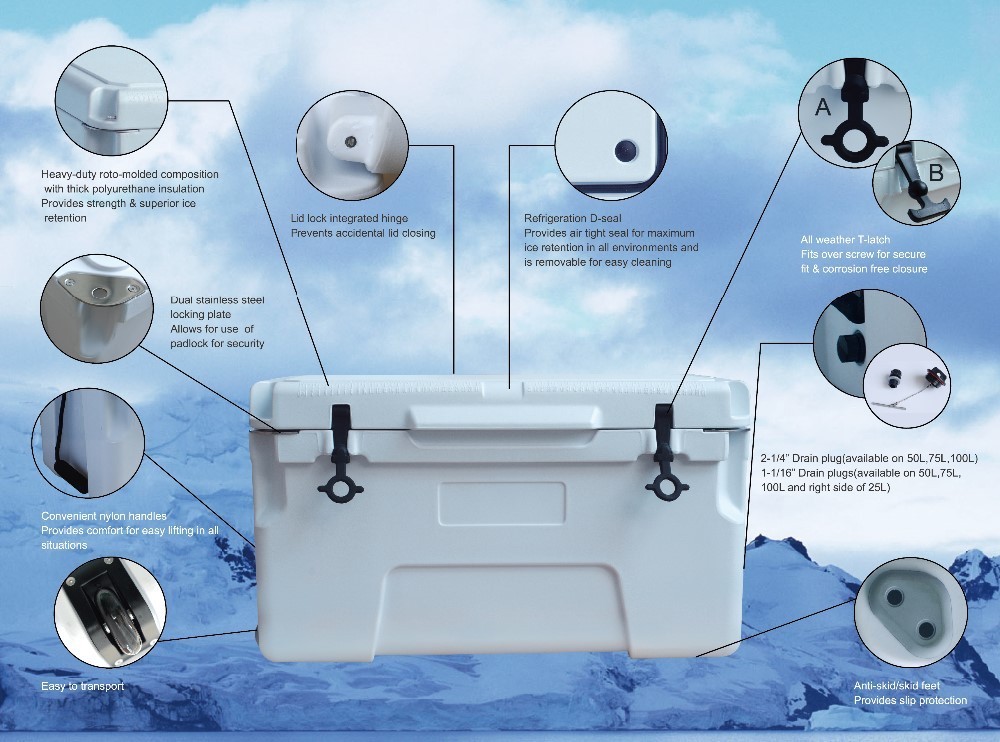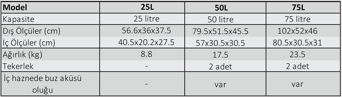 | Özellikler • Rota-kalıp teknolojisiyle öel olarak üretilen, yüksek kalite poli-etilen dış ve iç yüzey • Yüksek yoğunluklu poli-üretan (PU) izolasyon malzemesi •  Sızdırmaz, sıvı taşıma özelliği • Sıvı tahliye tapası ile kolay yıkanabilir ve temizlenebilir • Dayanıklı kauçuktan kırılmaz kapak mandalı • Ergonomik taşıma halkaları ve çift tekerlek sistemi ile kolay taşınabilir (tekerlek 50L ve 75L modellerde) • Çelik bariyerli çift kilitleme yuvası   Uygulama Alanları Cooler-Box, kan, kit, organ ve diğer biyolojik madde ve ilaçların soğuk ve güvenli taşınması için idealdir. |