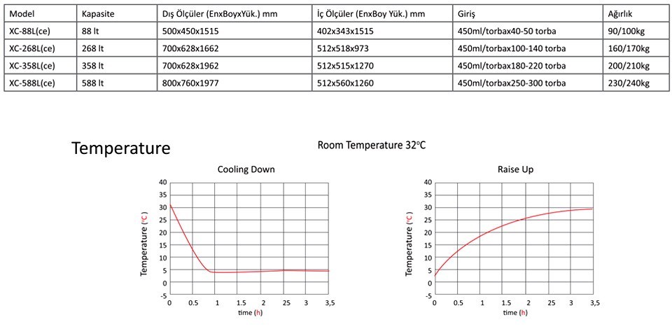 Florasan kabin içi aydınlatma XC-88L modelinde 3, XC-268L modelinde 4, XC-358L modelinde 5, XC-588L modelinde 6 adet plastik raf Sıcaklık veri yazıcısı: Standart